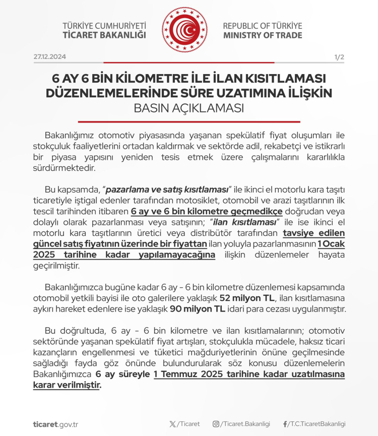 6 Ay ve 6 Bin Kilometre ile ilan kısıtlaması düzenlemelerinde süre uzatımına ilişkin basın açıklaması Ticaret Bakanlığı'ndan geldi. Bakanlıktan yapılan açıklamada, otomotiv piyasasında yaşanan spekülatif fiyat oluşumları ile stokçuluk faaliyetlerinin ortadan kaldırılması, sektörde adil, rekabetçi ve istikrarlı bir piyasa yapısının yeniden tesis edilmesi için çalışmaların kararlılıkla sürdürüldüğü kaydedildi.Bakanlığın bugüne kadar yapılan düzenleme kapsamında otomobil yetkilsii bayisi ile oto galericilere yaklaşık 52 milyon lira, ilan kısıtlamasına aykırı hareket edenlere ise yaklaşık 90 milyon lira idari para cezası uygulandığı belirtildi.