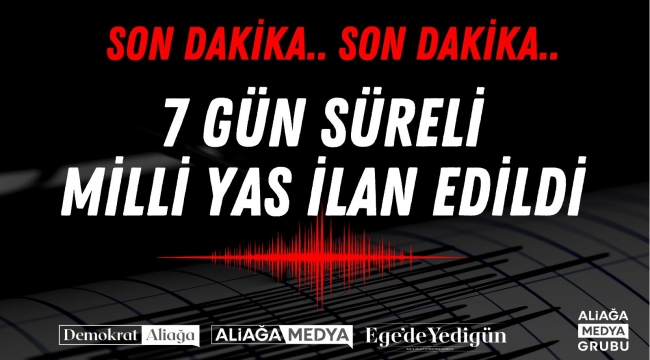 Cumhurbaşkanı Recep Tayyip Erdoğan, Türkiye'de meydana gelen depremler dolayısıyla 7 gün süreyle milli yas ilan edildiğini açıkladı.Erdoğan, ulusal yas ilanını sosyal medya hesabından duyurdu.Cumhurbaşkanı Erdoğan, dağıtım için bakanlıklara, Cumhurbaşkanlığı'na bağlı kurum, kuruluş ve ofislere, bilgi için de TBMM Başkanlığı'na gönderdiği yazısında, "6 Şubat 2023 tarihinde ülkemizde meydana gelen depremler sebebiyle yedi gün süreyle millî yas ilan edilmiştir. Bütün yurtta ve dış temsilciliklerimizde 12 Şubat 2023 Pazar günü güneşin batışına kadar bayrakların yarıyaa çekilmesi uygun görülmüştür. Bilgilerinizi ve gereğini rica ederim" ifadelerini kullandı.