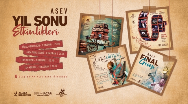 ASEV yıl sonu etkinliklerinin üçüncü günde (9 Haziran 2023 Cuma) Türk Halk Müziği Korosu, Sanat Yönetmeni Ali Hikmet Gökçen yönetiminde ‘Yaz Konseri’ ile, dördüncü gün ise (10 Haziran 2023 Cumartesi), Türk Sanat Müziği Korosu Sanat Yönetmeni Barış Doğan yönetiminde ‘Unutulmaz Şarkılar’ ile müzik tutkunlarının karşısına çıkacak. Aliağa Belediyesi Ulaş Bayam Açıkhava Tiyatrosu’ndaki konserler saat 20.30’da başlayacak.