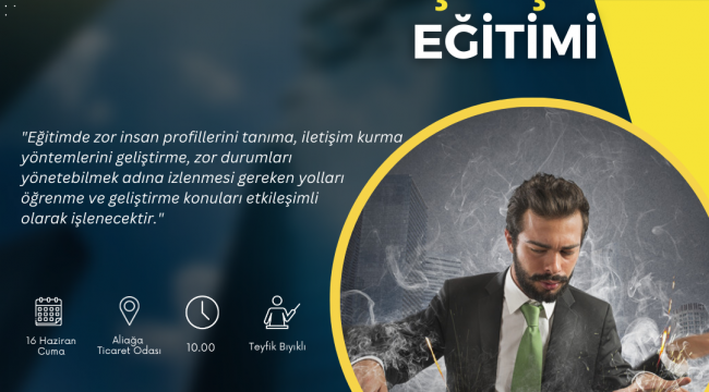 Kişilik Tipleri ve Zor İnsanlarla Çalışma Eğitimi, 2023 yılı için planlanan eğitimi takvimi kapsamında 16 Haziran 2023 (Cuma) günü, saat 10.00’da Aliağa Ticaret Odası M. Ender Özer Seminer Salonu’nda düzenlenecek.