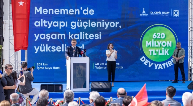 İzmir Büyükşehir Belediyesi İZSU Genel Müdürlüğü, Menemen’de yeni içme suyu, atık su ve yağmur suyu hatlarını kapsayan 620 milyon liralık altyapı yatırımını hayata geçirdi. İzmir Büyükşehir Belediye Başkanı Dr. Cemil Tugay tarafından Menemen Cumhuriyet Meydanı’nda düzenlenen törende Menemen’e can suyu olacak dev yatırım hizmete açıldı. 20 bin vatandaşın yararlanacağı çalışmalar kapsamında Emiralem, Türkelli, Doğa, Yanık, Haykıran, Seyrek ve Villakent mahallelerinde toplam 209 kilometre içme suyu, 40 kilometre atık su ve yağmur suyu hattı ile 160 bin metrekare parke serim çalışması yapıldı.