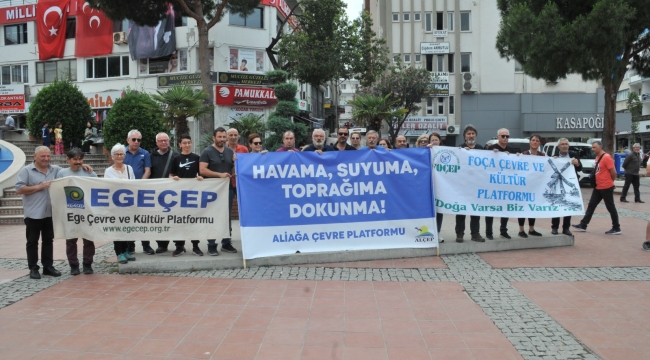 Demokrasi Meydanı'nda bir araya gelen Egeçep, Alçep, Foçep çevre platformu üyeleri basın açıklaması yaptı. Açıklamada söz alan EGEÇEP Eş Sözcüsü Süleyman Eryılmaz şunları söyledi: "Açıklama için Aliağa seçmemizin en önemli nedeni burada hem santraller hem de buradan çıkan cürufların toplanması. Eğer biz fosil yakıtlardan çıkamazsak yaşadığınız iklim krizinin facialarıyla karşı karşıya kalacağız" dedi.